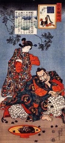 This vintage Japanese warrior poster shows a male and female samurai dressed in kimono's at home.